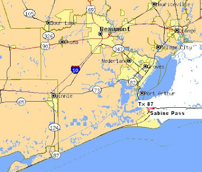Sabine Pass is on the Gulf of Mexico at the southeastern tip of Jefferson County and sits astride the Texas-Louisiana border. A little sliver of Texas Highway 87 keeps Sabine Pass attached to Port Arthur. The latter city annexed Sabine Pass in 1978. Their Fire Station No. 4, shown above, was heavily damaged in September 2005 by Hurricane Rita and rebuilt in 2006 into a very nice new station by the ABC-TV “Extreme Makeover: Home Edition” show.